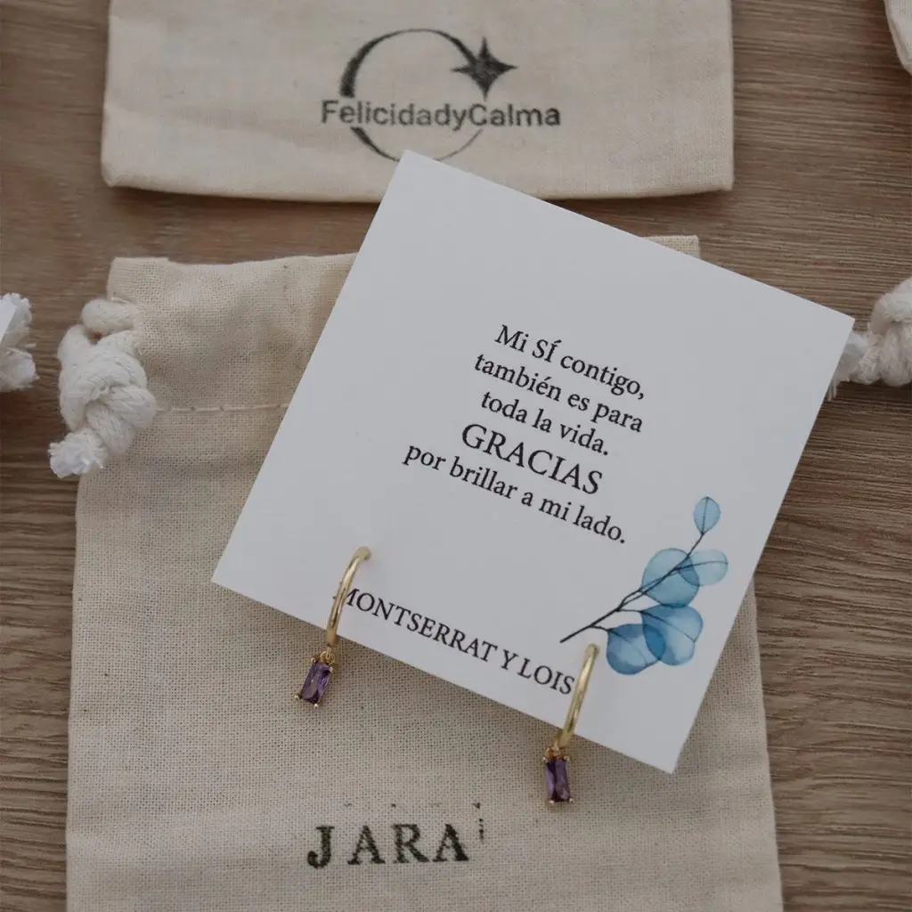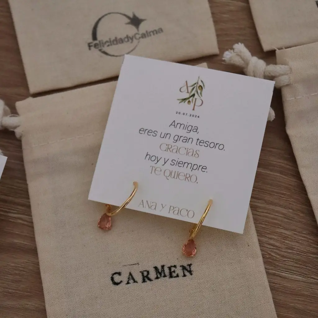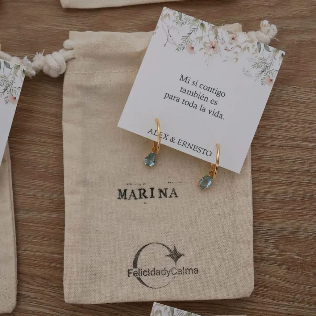 Los pendientes van dentro de un saquito perfumado y personalizado. Un detalle que te envuelve en un momento mágico.